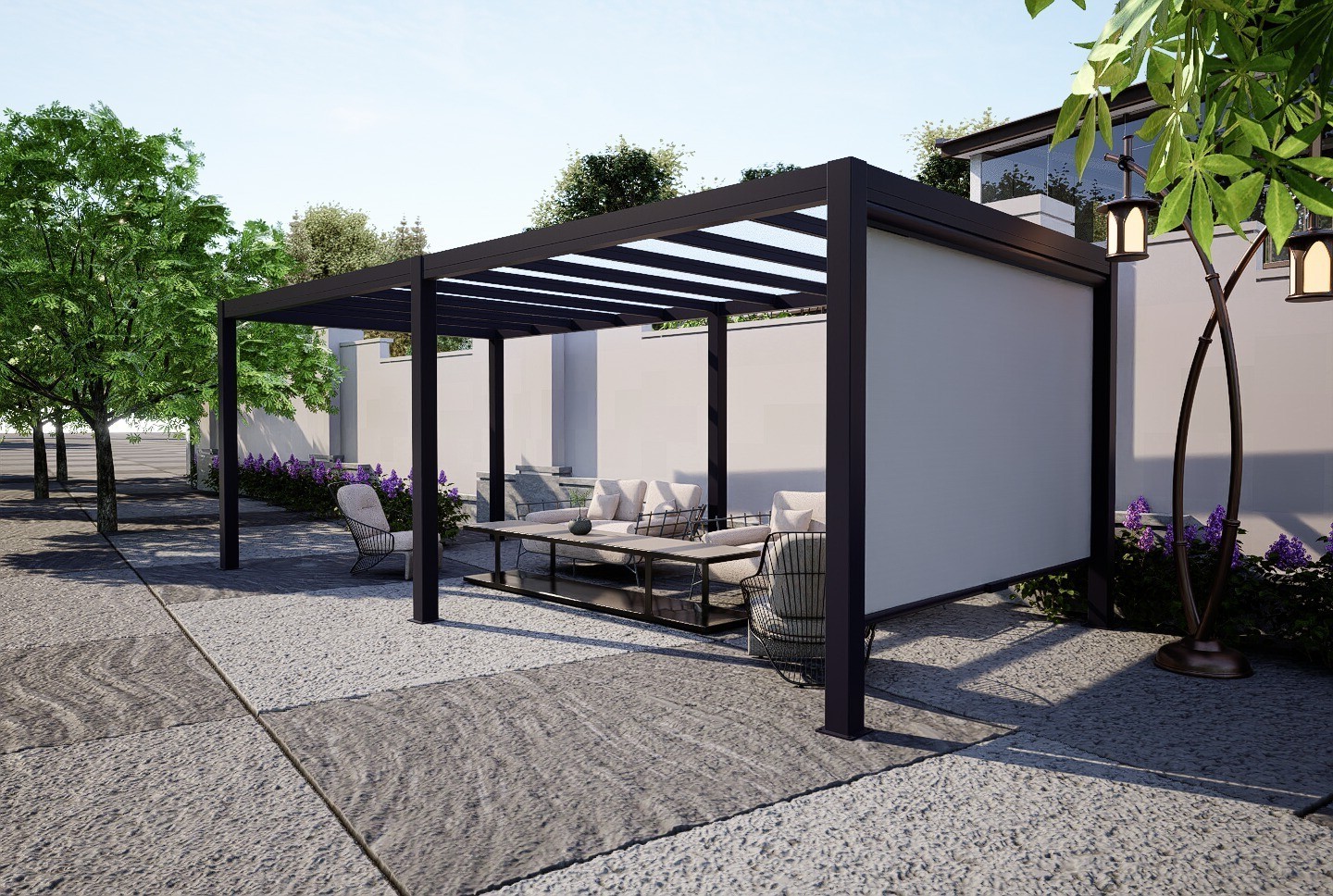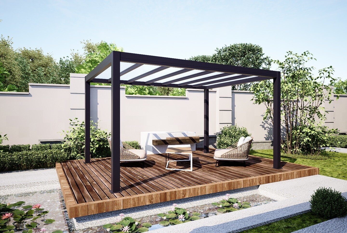 Pergola Carbon Flat jest wytrzymałą ogrodową/rekreacyjną konstrukcją wolnostojącą z płaskim dachem. Nie wymaga zakotwienia do elewacji budynku. Ma unikalny nowoczesny kształt oraz jest uniwersalna pod kątem montażu dodatkowych elementów. Zmniejsza oddziaływanie słońca, chroni przed umiarkowanym deszczem ( do 7,5mm/h ). Po domontowaniu dodatkowych elementów takich jak ściany szklane przesuwne, po zamknięciu tworzy tarasową osłonę przed wiatrem, nawiewającymi liśćmi oraz (po domontowaniu uszczelek między szybami) śniegiem.